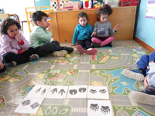 - Libros de huellas. Tenemos imágenes de huellas y un libro donde aparecen las huella junto a la imagen y el nombre del animal. Lanzamos hipótesis sobre a quién pertenecen unas huellas determinadas, llegamos a ellas con el Bee bot y después comprobamos en el libro si hemos acertado.